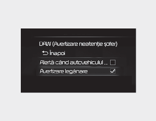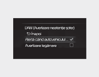Cu butonul ENGINE START/STOP în poziția ON, selectați sau deselectați „Driver Assistance → Driver Attention Warning” (Asistență șofer → Avertizare atenție șofer) din meniul Setări pentru a seta dacă folosiți sau nu fiecare funcție.