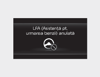 Dacă șoferul încă nu ține mâinile pe volan după avertizarea pentru punerea mâinilor pe volan, mesajul de avertizare „Lane Following Assist (LFA) canceled” (Sistem de Asistență menținere bandă (LFA) anulat) va fi afișat și sistemul de Asistență menținere bandă va fi anulat automat.