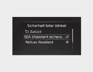 Wählen Sie, wenn der ENGINE START/STOP-Knopf in Position ON steht, im Einstellungsmenü die Option „Fahrerassistenz → Totwinkelsicherheit → Ausstiegsassistent“, um den Assistent für den sicheren Ausstieg einzuschalten bzw. die Funktion zu deaktivieren.
