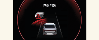 긴급 제동에 의한 정차 시 계기판 등에 경고문이 표시됩니다. 안전을 위해 즉시 브레이크 페달을 밟고 주변 상황을 확인하십시오.