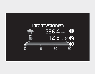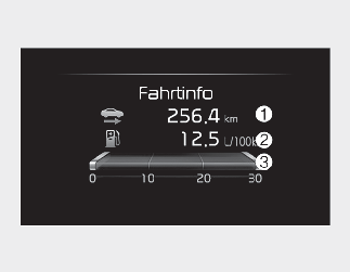 Dieser Bildschirm zeigt die Gesamtfahrstrecke (1), den Durchschnittsverbrauch (2) und den aktuellen Verbrauch (3) und die Gesamtfahrzeit (4) nach dem Auftanken.
