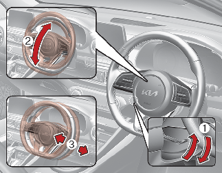 2. Adjust the steering wheel to the desired angle (2) and height (3). Move the steering wheel, so it points toward your chest, not toward your face. Make sure you can see the instrument panel warning lights and gauges. After adjusting, pull up the lock.