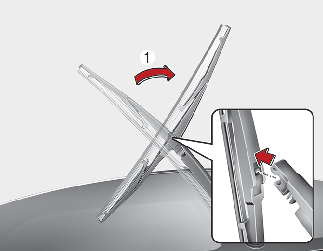 Lift up the wiper blade clip (1). Then pull down the blade assembly (2) and remove it.