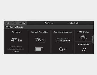 The Plug-in Hybrid menu consists of five sections: [EV range], [Energy information], [Charge management], [ECO driving], [Energy flow].