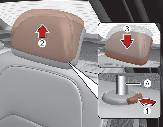 Pull it up to the desired position (1). To lower the headrest, push and hold the release button (2) on the headrest support and lower the headrest to the desired position (3).