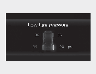 When the tyre pressure monitoring system warning indicators are illuminated and warning message displayed on the cluster LCD display, one or more of your tyres is significantly under-inflated. The low tyre pressure position telltale light will indicate which tyre is significantly under-inflated by illuminating the corresponding position light.