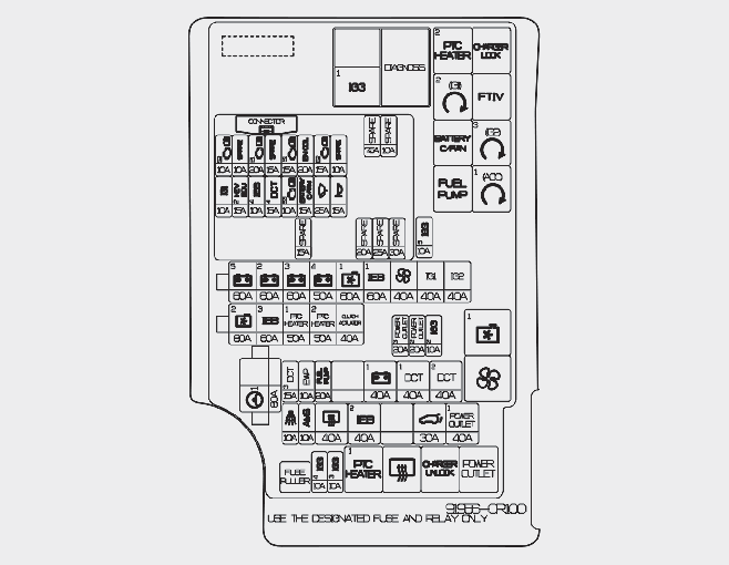 ICU Junction Block (Fuse Name: TAIL GATE, P/WDW RH, P/WDW RH, P/SEAT DRV, S/HEATER FRT, IG3, P/SEAT PASS, MDPS (Motor Driven Power Steering), SUNROOF 2, SUNROOF 1) |