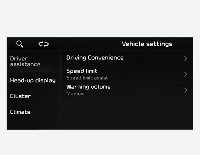 Select Settings → Vehicle → Driver assistance on the infotainment system screen to set the Driver Assistance function.