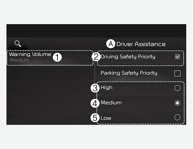 If Driving Safety Priority is selected, the audio volume will temporarily decrease to warn the driver with the audible warning for safe driving.