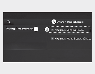 With the vehicle on, select Settings → Driver Assistance → Driving Convenience → Highway Driving Assist on the instrument cluster or Settings → Vehicle → Driver Assistance → Driving Convenience → Highway Driving Assist on the infotainment system.
