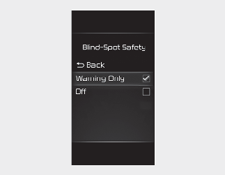 Dacă schimbați setarea de la ‘Off’ (Oprit) la ‘Warning Only’ (Doar avertizare), indicatorul de avertizare de pe oglinda retrovizoare exterioară va clipi timp de trei secunde.