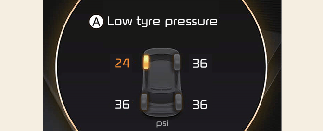 When the tyre pressure monitoring system warning indicators are illuminated and warning message displayed on the cluster LCD display, one or more of your tyres is significantly under-inflated. The low tyre pressure position telltale light will indicate which tyre is significantly under-inflated by illuminating the corresponding position light.