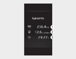 Dette displayet viser akkumulert turlengde (1), gjennomsnittlig drivstofforbruk (2) og total kjøretid (3).