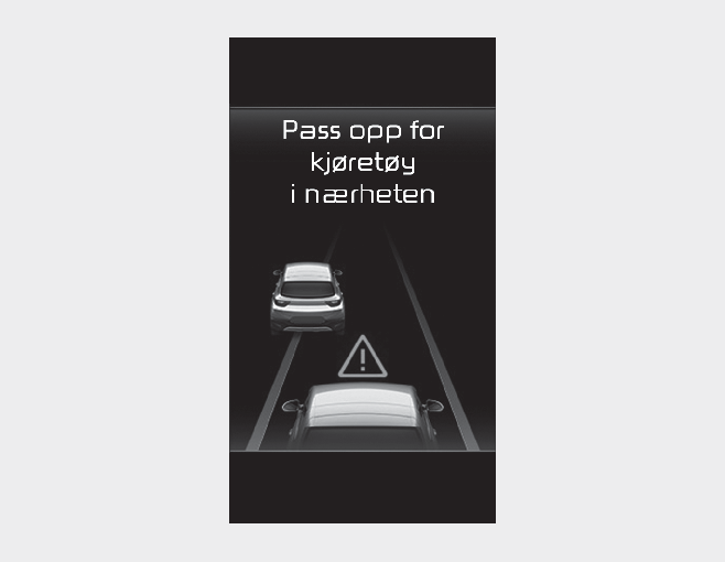 I følgende situasjon vil varselmelding 'Vær oppmerksom på kjøretøy i nærheten' vises på instrumentpanelet og et lydvarsel vil høres for å varsle føreren om veiforhold foran.