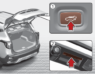 Press the power tailgate open/close inner button (1) and outer switch (2) simultaneously until a chime sounds.