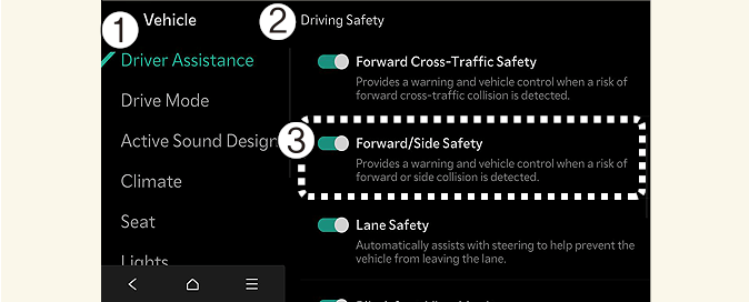 Настройки безопасности движения вперед включают «Основную функцию», «Функция поворота перекрестка» и «Функция прямого включения». Система безопасности при пересеченном движении спереди включает в себя функцию предупреждения при пересечении перекрестка, а система обеспечения безопасности спереди/сбоку — функцию подготовки к перестройке в другой ряд, функцию контроля перестройки в другой ряд и функцию помощи в уклонении от столкновения. (при наличии)