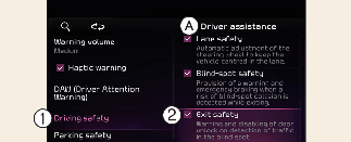 Dok vozilo radi, dodirnite Postavke → Pomoć vozaču → Glasnoća upozorenja na upravljačkoj ploči ili Postavke → Vozilo → Pomoć vozaču → Sigurnost u vožnji → Sigurnost izlaza na upravljačkoj ploči ili Postavke → Vozilo → Pomoć vozaču → Sigurnost u vožnji → Sigurnost izlaza u informacijsko-zabavnom sustavu.
