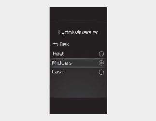 Med tenningsbryteren eller ENGINE START/STOP (start/stopp-knappen) i ON, velg 'Førerassistanse Varselvolum' fra menyen Innstillinger for å endre den volumet for advarsler til 'Høy', Medium', 'Lav' eller 'Av' for System for blindsonesikkerhet.