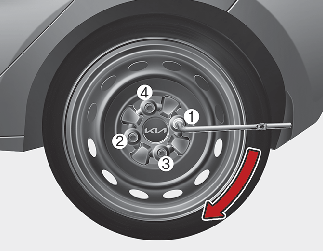 Plasser deretter nøkkelen som vist på bildet, og stram til hjulmutrene. Kontroller at fatningen er godt plassert over hele mutteren. Ikke bruk foten på nøkkelhåndtaket, og bruk heller ikke en rørforlenger over nøkkelhåndtaket. Stram deretter til annenhver mutter rundt dekket. Dobbeltsjekk at alle mutrene er godt tilstrammet. Etter utskifting av dekk bør du få systemet kontrollert på et profesjonelt verksted. Kia anbefaler at du oppsøker en godkjent Kia-forhandler/servicepartner.