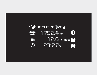 V tomto zobrazení jsou uvedené denní kilometry (1), průměrná spotřeba paliva (2) a celková doba jízdy (3) v jednom jízdním cyklu.