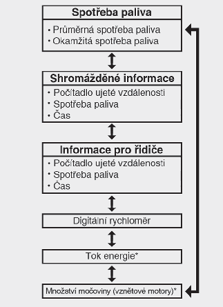 Průměrná spotřeba paliva se počítá z celkové ujeté vzdálenosti a spotřebovaného paliva od předchozího vynulování hodnoty průměrné spotřeby.