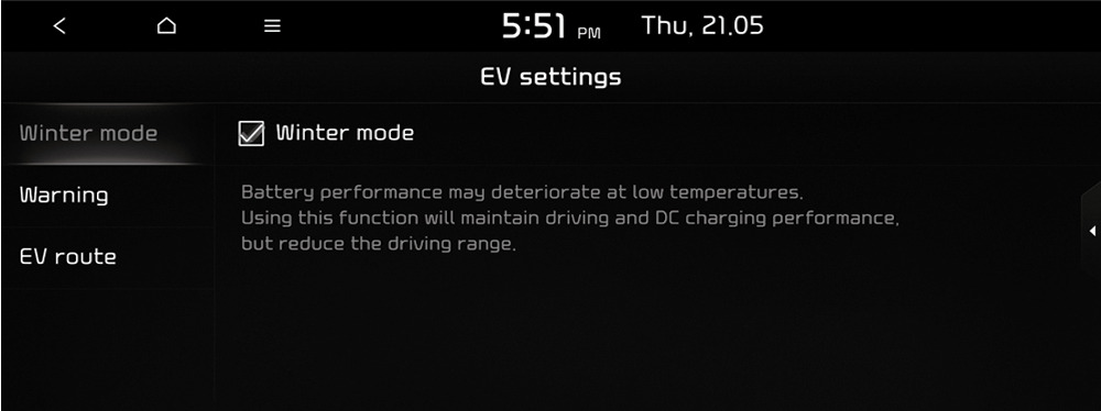 The Winter mode is efficient during the winter time when the high voltage battery temperature is low. This mode is recommended to improve driving and DC charging performances during winter by raising the battery temperature to an adequate level. However, this may reduce the distance to empty significantly as the high voltage battery consumes a lot more electricity.