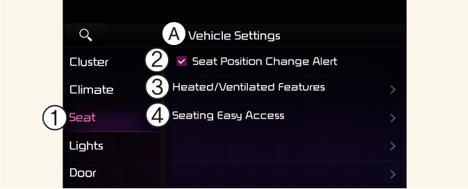 Válassza a Setup→Vehicle Settings→Seat (Beállítás → Járműbeállítások → Ülés) pontot az infotainment rendszer Beállítások menüjéből a számos biztonsági funkció használatához.