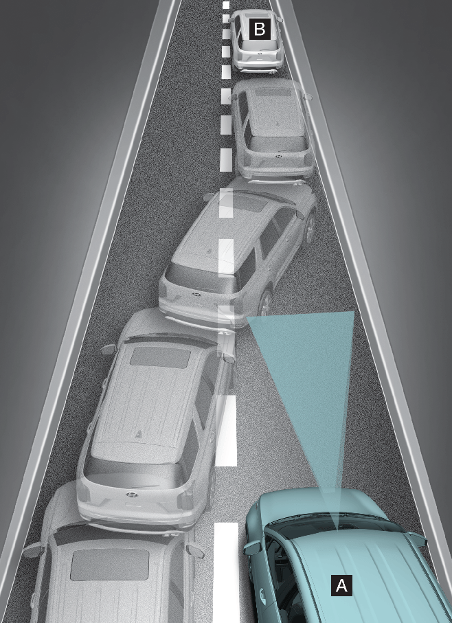 A szomszédos sávból áttérő gépkocsit (B) az érzékelő nem képes észlelni egészen addig, amíg az be nem ér az érzékelő észlelési tartományába. Lehet, hogy a Frontális ütközés-elkerülő segéd nem azonnal észleli a járművet, ha az hirtelen vált sávot. Ilyen esetben biztonságos féktávolságot kell tartania, szükség esetén pedig a biztonságos távolság érdekében kormányoznia kell a járművet és rá kell lépnie a fékpedálra.