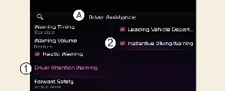 ON állásba állított jármű mellett válassza a Felhasználói beállítások → Vezetősegéd → Vezető figyelmeztetése elemet a műszercsoporton, vagy válassza a Beállítások → Jármű → Vezetősegéd → Vezető figyelmeztetése elemet az infotainment rendszerben, hogy beállítsa, szeretné-e használni ezt a funkciót.