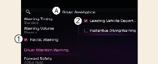 A jármű bekapcsolt állapotában válassza a Driver assistance → Warning timing (Vezetéssegítő rendszer → Figyelmeztetés időzítése) elemet a Settings (Beállítások) menüben a Vezetőfigyelmeztető funkció aktiválási idejének módosításához.
