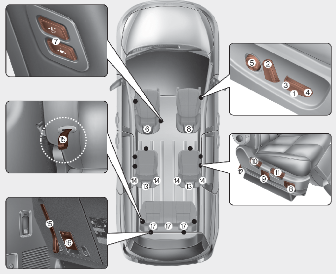 * There was no seat on rear 2nd-row centre at vehicle with 7 seating positions.