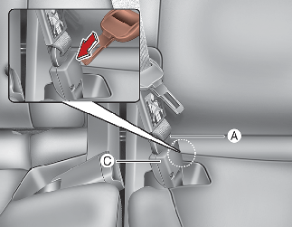 To retract the rear centre seatbelt, insert the tongue plate or similar small rigid device into the web release hole (C). Pull up on the seat belt web (A) and allow the webbing to retract automatically.