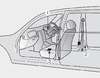 The seat belt pre-tensioner system consists mainly of the following components. Their locations are shown in the illustration: