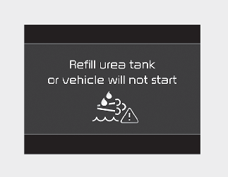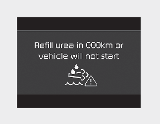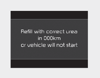 Otherwise, the vehicle can't be restarted once the engine is turned off by the ENGINE START/STOP button. Based on the driving pattern, environmental condition and road profile, the deducted remaining mileage may differ from the actual travel distance. When "Low Urea" or "Refill Urea" message is displayed, a sufficient amount of urea solution must be added. When "Refill Urea in 000 km or vehicle will not start" message is displayed, refill a sufficient amount of urea solution.