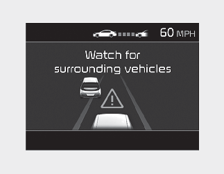 If the vehicle ahead (vehicle speed: less than 20 mph (30 km/h)) moves to the next lane, the warning chime will sound and a message will appear. Adjust your vehicle speed for vehicles or objects that can suddenly appear in front of you by depressing the brake pedal according to the road and driving conditions.