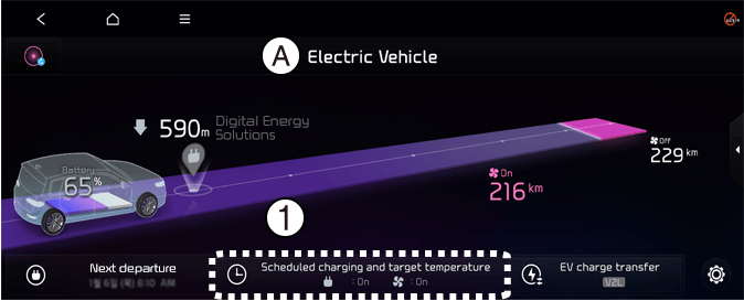 حدد EV → Scheduled charging and target temperature (الشحن المجدول ودرجة الحرارة المستهدفة) على الشاشة.