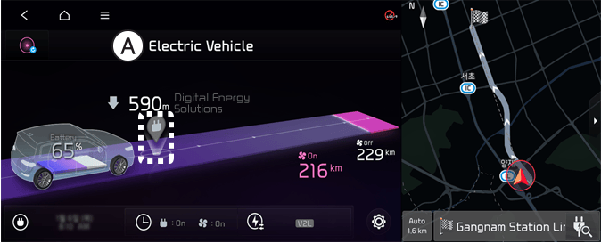 حدد EV (السيارة الكهربائية) من شاشة نظام المعلومات والترفيه. وسيتم البحث حول الموقع الحالي.