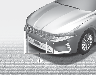 전방/후방 주차 거리 경고는 차량이 전진 또는 후진할 때 차량 전/후방 초음파센서(1), (2)로부터 일정 거리 이내에 있는 사람, 동물 또는 물체와의 거리를 감지하여 표시등 또는 경고음으로 운전자에게 알려주는 주차 안전 기능입니다.