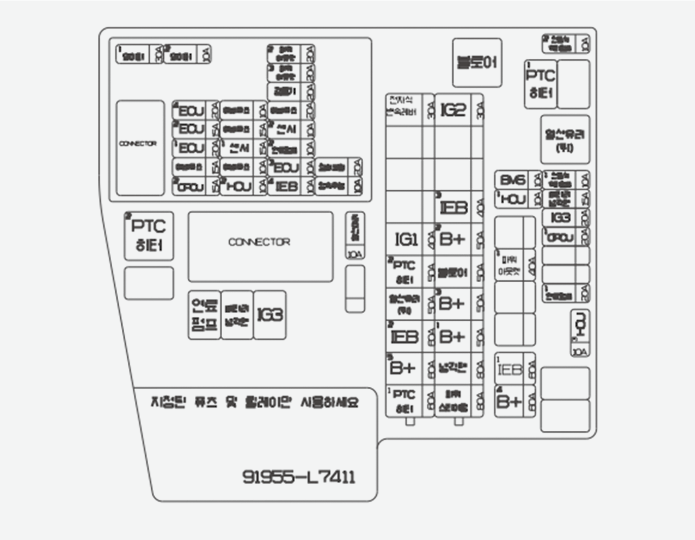 * 엔진룸 퓨즈 박스 내 이름 없는 공란 퓨즈는 예비퓨즈가 아니므로 임의로 빼지 마십시오. 임의로 뺄 경우 해당 시스템이 작동하지 않을 수 있습니다.
