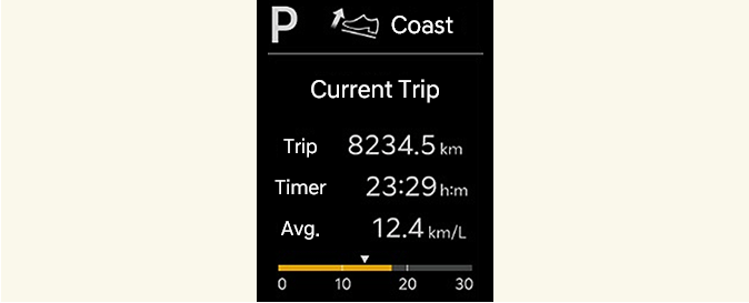 Se va auzi un semnal sonor, iar indicatorul ghidului pentru deplasare inerțială va fi afișat pentru a informa șoferul când să ia piciorul de pe accelerație, anticipând un eveniment de decelerare* bazat pe analiza rutelor de conducere și a condițiilor rutiere stocate în sistemul de navigație. Încurajează șoferul să ia piciorul de pe pedală și să permită deplasarea inerțială pe drum doar cu motorul EV. Acest lucru ajută la prevenirea consumului inutil de combustibil și crește eficiența combustibilului.