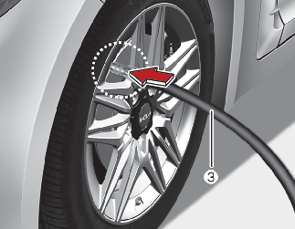 Kierrä viallisen renkaan venttiilin korkki auki ja kierrä tiivistysainepullon täyttöletku (3) venttiiliin.