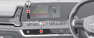 Front view function is displayed on the screen when the gear is in N (Neutral) or D (Drive) to assist in parking. The front view has a top view, front view, and side view. Also, other view modes can be selected by pressing the view icons (2) on the Surround View Monitor screen.