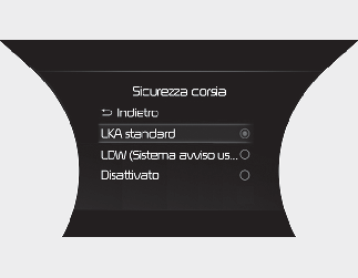 Quando l'Assistenza al mantenimento della corsia è disattivata con il pulsante Lane Safety (Sicurezza corsia), le impostazioni di Sicurezza corsia saranno disattivate.