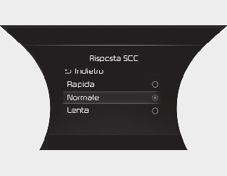È possibile regolare la sensibilità della velocità rispetto al veicolo che precede per mantenere la distanza impostata. Andare su “User Settings (LCD display) or Settings → Vehicle (Infotainment System screen) → Driver Assistance → SCC Reaction → Fast/Normal/Slow" (Impostazioni utente (display LCD) o Impostazioni → Veicolo (schermata Sistema Infotainment) → Assistenza conducente → Reazione SCC → Lenta/Normale/Rapida). Si può selezionare uno dei tre stadi a scelta.