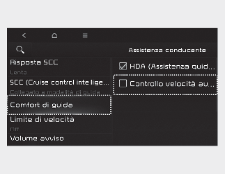 Con il pulsante ENGINE START/STOP (avviamento/arresto motore) in posizione ON, selezionare o deselezionare "Driver Assistance → Driving Convenience" (Assistenza conducente → Comfort di guida) nel menu "User Settings (LCD display)" (Impostazioni utente [display LCD]) o "Settings → Vehicle (Infotainment System screen)" (Impostazioni → Veicolo [schermata Sistema Infotainment]), per stabilire se avvalersi o meno di ciascuna funzione.