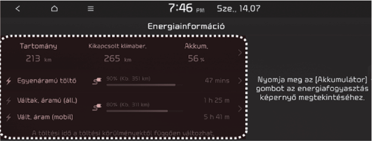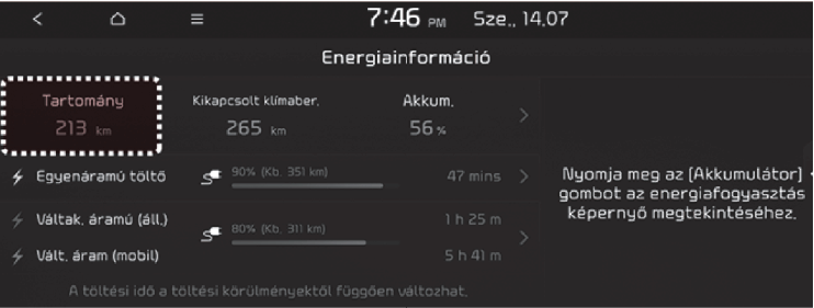 Válassza az [EV → Energiafogyasztási információ → Vezetési tartomány, akkumulátor] lehetőséget a kijelzőn.