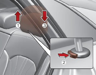 لخفض مسند الرأس، ادفع زر التحرير (٢) مع الاستمرار بدعامة مسند الرأس، ثم اخفض مسند الرأس للوضع المطلوب (٣).