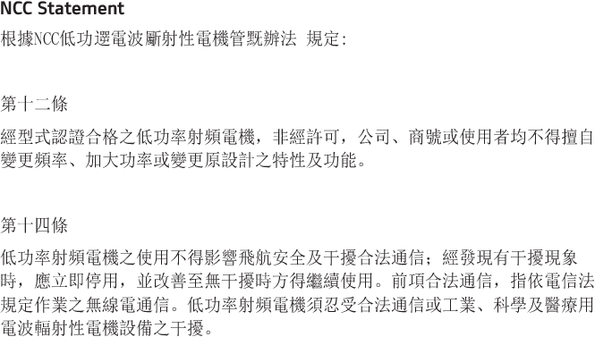 وفقًا للوائح الفنية الخاصة بأجهزة التردد اللاسلكي منخفضة الطاقة التابعة للجنة الاتصالات الوطنية (NCC): المادة 12، لا يجوز لأي شركة أو مؤسسة أو مستخدم تغيير التردد أو زيادة الطاقة أو تغيير خصائص ووظائف التصميم الأصلي للجهاز الكهربائي ذي التردد المنخفض المعتمد، دون الحصول على إذن. المادة 14، يجب ألا يؤثر استخدام الأجهزة الكهربائية ذات التردد المنخفض على سلامة الملاحة وألا يتداخل مع أي اتصال قانوني، إذا تم العثور على تداخل، سيتم تعليق الخدمة حتى يتم التحسين وينعدم التداخل.