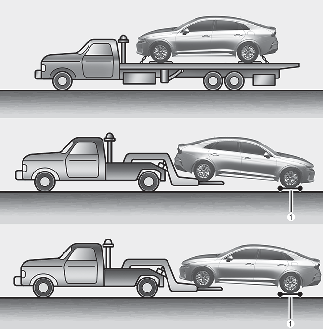 إجراءات الرفع والقطر الصحيحة ضرورية لمنع تلف السيارة. يوصى باستخدام الدليات المزودة بعجلات (١) أو المعدات المستوية.