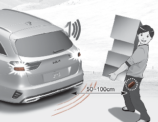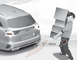 Se estiver posicionado na área de deteção (50 a 100 cm atrás do veículo) com uma Smart Key, as luzes de emergência vão piscar e o sinal sonoro irá soar durante 3 segundos para o alertar que a Smart Key foi detetada e que a porta da bagageira vai abrir.